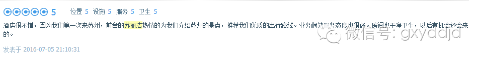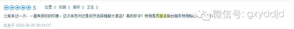 苏丽洁是苏州国信雅都大酒店工作了8年多的一位前厅部总台资深主管她对客热心、耐心、贴心8年多来始终奋战于对客服务的第一线总台在自己平凡的工作岗位上奉献着青春年华心系每一位宾客,视宾客为亲人视宾客为家人的服务理念扎根于雅都大酒店坚守总台岗位的同时令宾客体会到了满意加惊喜的服务 赢得了宾客无数的赞许